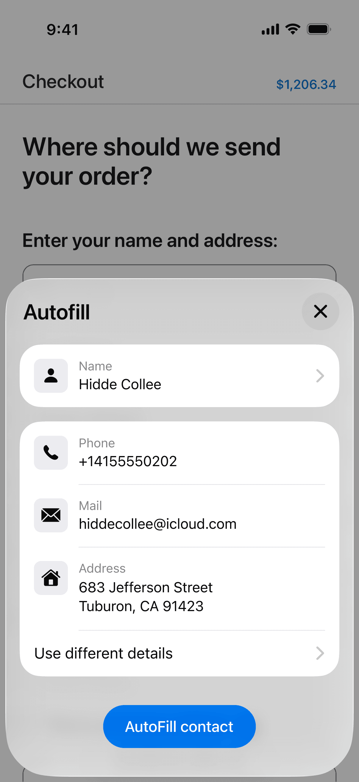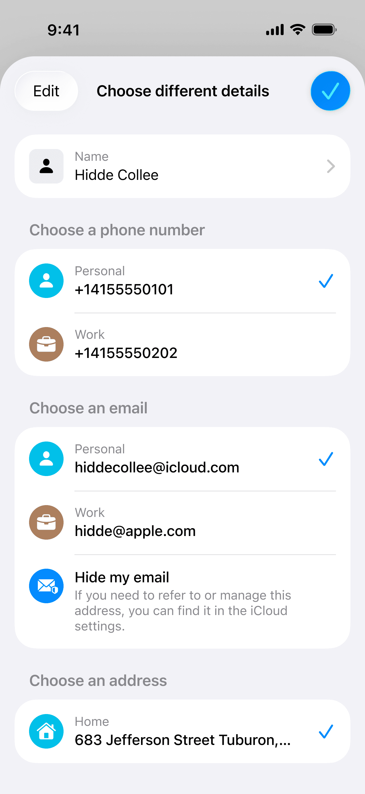 I redesigned the AutoFill pop‑up in iOS to make form filling clearer and more flexible. The new interface displays each detail, name, phone, email and address, with an icon and label, so you instantly know what’s being used. A new “Use different details” option lets you choose from personal and work numbers, select between multiple emails (including Hide My Email), and pick the right address or even select another contact, so the right information always goes into the form.